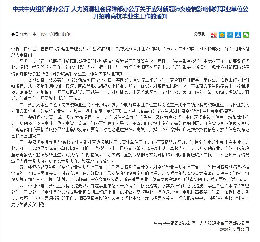 习近平总书记在统筹推进新冠肺炎疫情防控和经济社会发展工作部署会议上强调,“要注重高校毕业生就业工作,统筹做好毕业、招聘、考录等相关工作,让他们顺利毕业、尽早就业”。为切实贯彻落实习近平总书记的重要讲话精神,现就应对新冠肺炎疫情影响做好事业单位公开招聘高校毕业生工作有关事项通知如下。