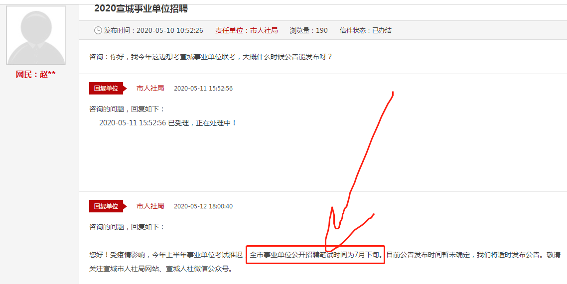 受疫情影响,今年事业单位考试已往后推迟,近日,有网友在宣城市人社局上提问:今年事业单位什么时候笔试?11日人社局也是给出了回复:全市事业单位公开招聘笔试时间为:7月下旬!小编带大家一起去看看吧: