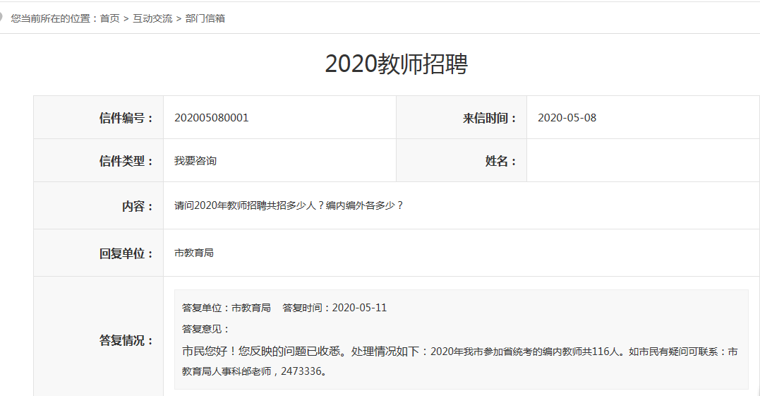 | 市民您好!您反映的问题已收悉。处理情况如下:2020年我市参加省统考的编内教师共116人。如市民有疑问可联系:市教育局人事科邰老师,2473336。 | |||
