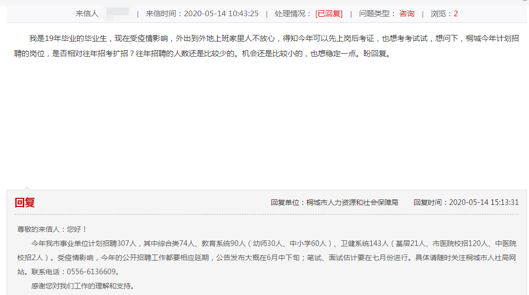5月14日考生向桐城人社局提问事业单位招聘情况,以下是详细内容: