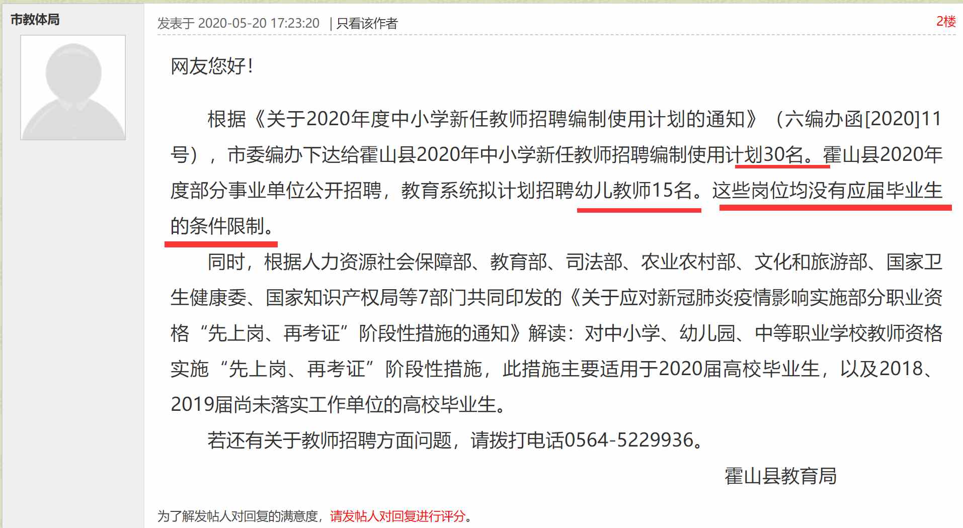根据《关于2020年度中小学新任教师招聘编制使用计划的通知》(六编办函[2020]11号),市委编办下达给霍山县2020年中小学新任教师招聘编制使用计划30名。霍山县2020年度部分事业单位公开招聘,教育系统拟计划招聘幼儿教师15名。这些岗位均没有应届毕业生的条件限制。