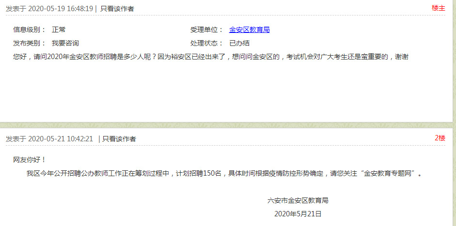 我区今年公开招聘公办教师工作正在筹划过程中,计划招聘150名,具体时间根据疫情防控形势确定,请您关注“金安教育专题网”。