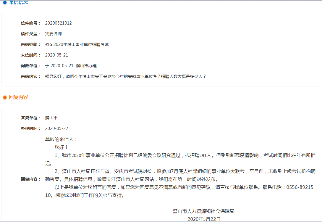 来信内容:领导您好,请问今年潜山市会不会参加今年的安徽事业单位考?招聘人数大概是多少人?