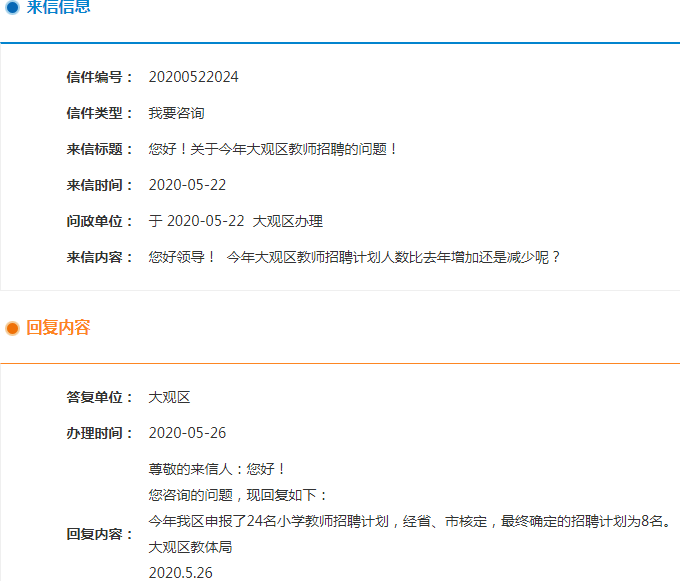 来信内容:您好领导! 今年大观区教师招聘计划人数比去年增加还是减少呢?