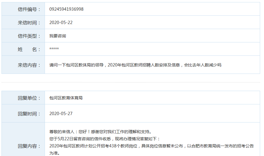 来信内容:请问一下包河区教体局的领导,2020年包河区教师招聘人数安排及信息,会比去年人数减少吗