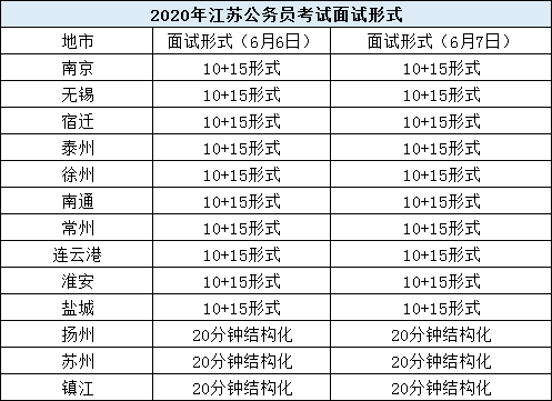 今年采用10+15模式的面试形式比较多,只有扬州、苏州、镇江采用的是20分钟结构化的形式(如下图):