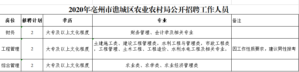 2020年亳州市谯城区农业农村局公开招聘工作人员公告