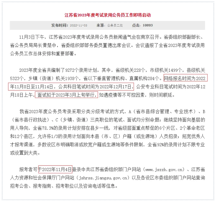 2023江苏公务员考试消息已出,快来查收重要信息:招录人数:9272人,其中,省级机关228个,市级机关1499个,县级机关5323个,乡镇(街道)机关1938个,省以下垂直管理机构、直属机构284个。