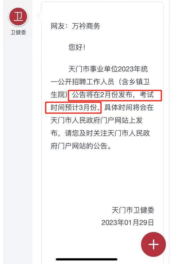 天门卫健委回复:天门市事业单位2023年统一公开招聘工作人员(含乡镇卫生院)公告将在2月份发布,考试时间预计3月份……